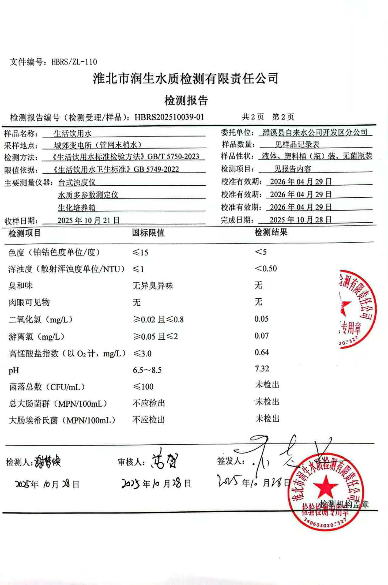 濉溪县自来水公司开发区分公司2025年10月下半月检测报告(管网水)