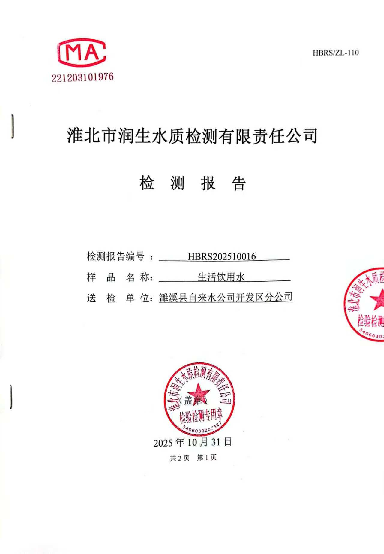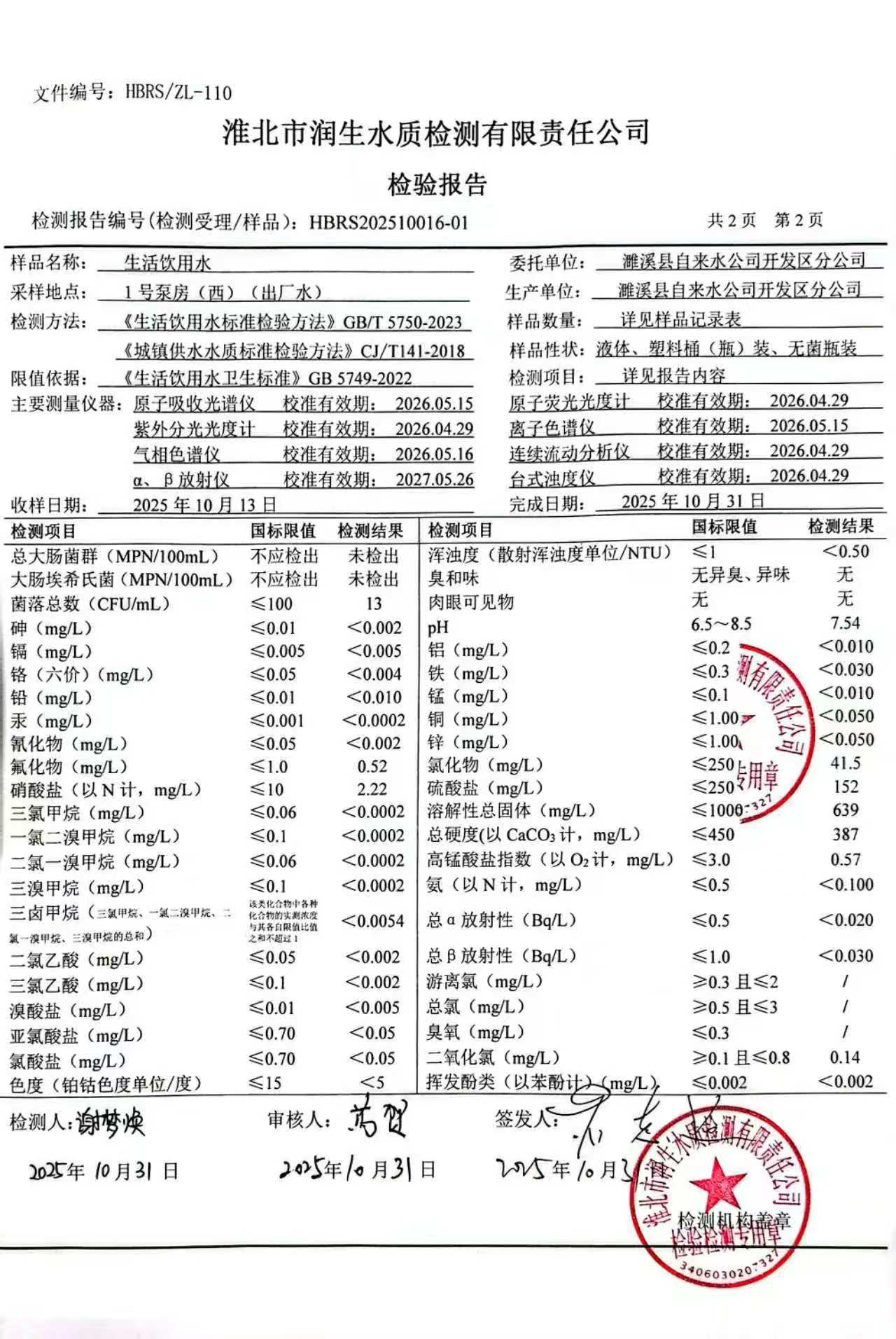 濉溪县自来水公司开发区分公司2025年10月月检水质检测报告(出厂水)