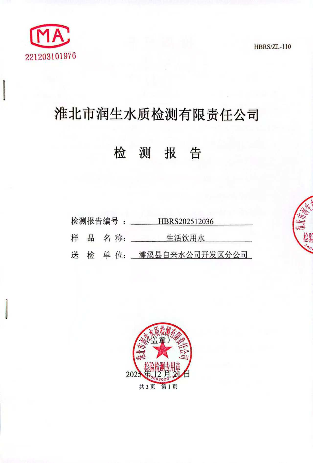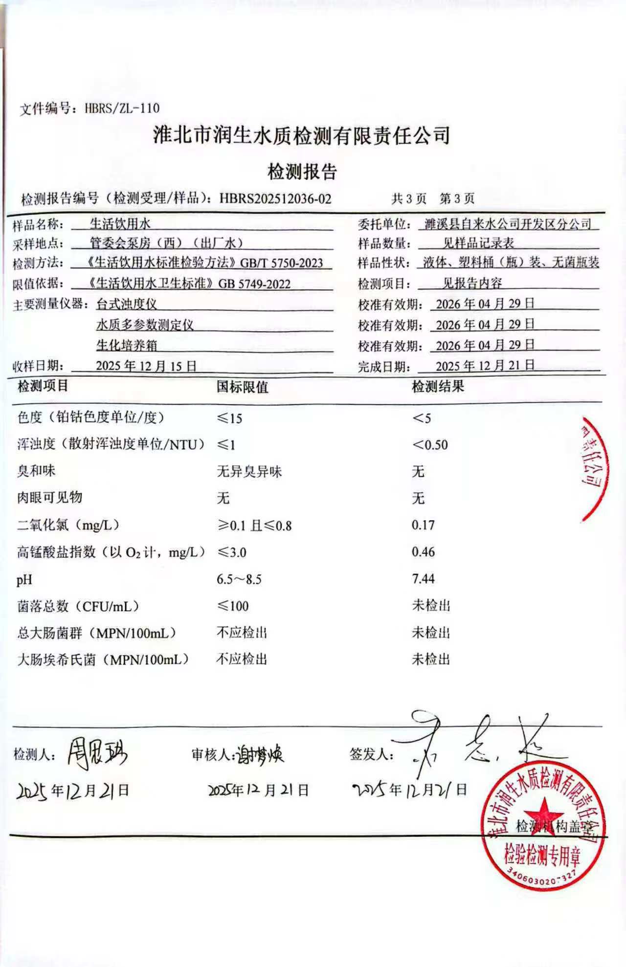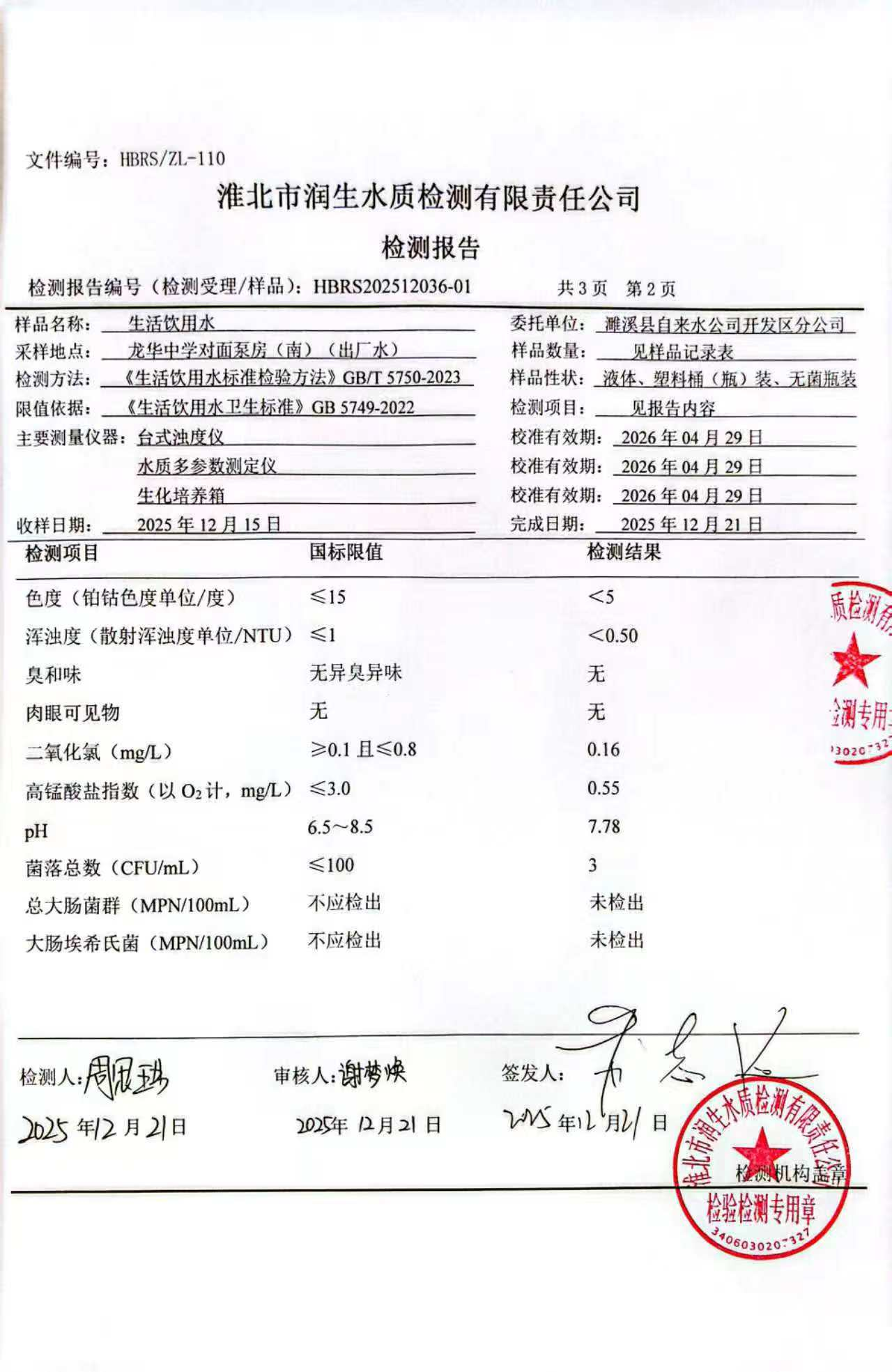 濉溪县自来水公司开发区分公司2025年12月第3周检测报告(出厂水)