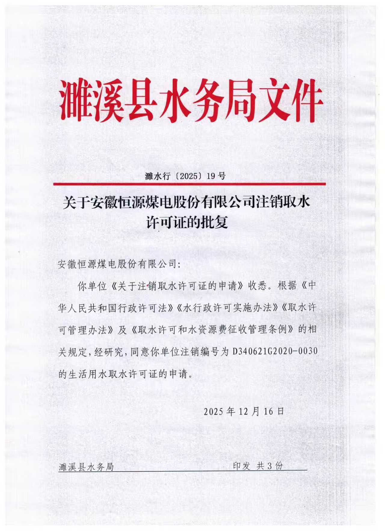 关于安徽恒源煤电股份有限公司注销取水许可证的批复 |