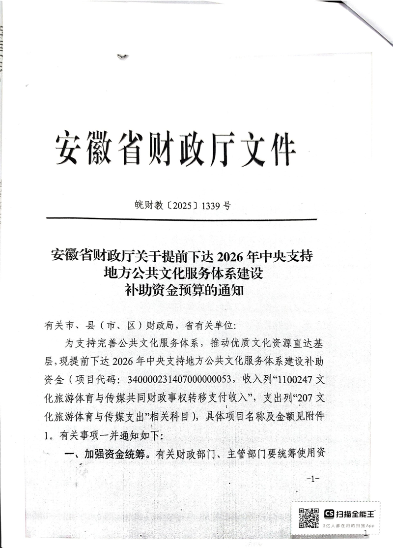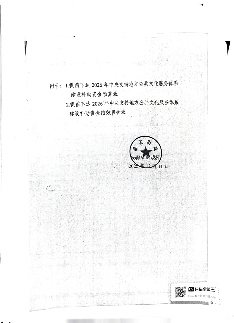 安徽省财政厅关于提前下达2026年中央支持地方公共文化服务体系建设补助资金预算的通知