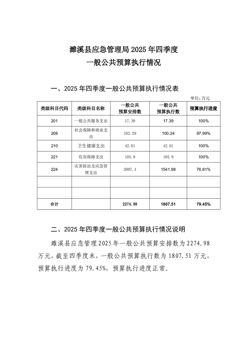 濉溪县应急管理局2025年四季度一般公共预算执行情况