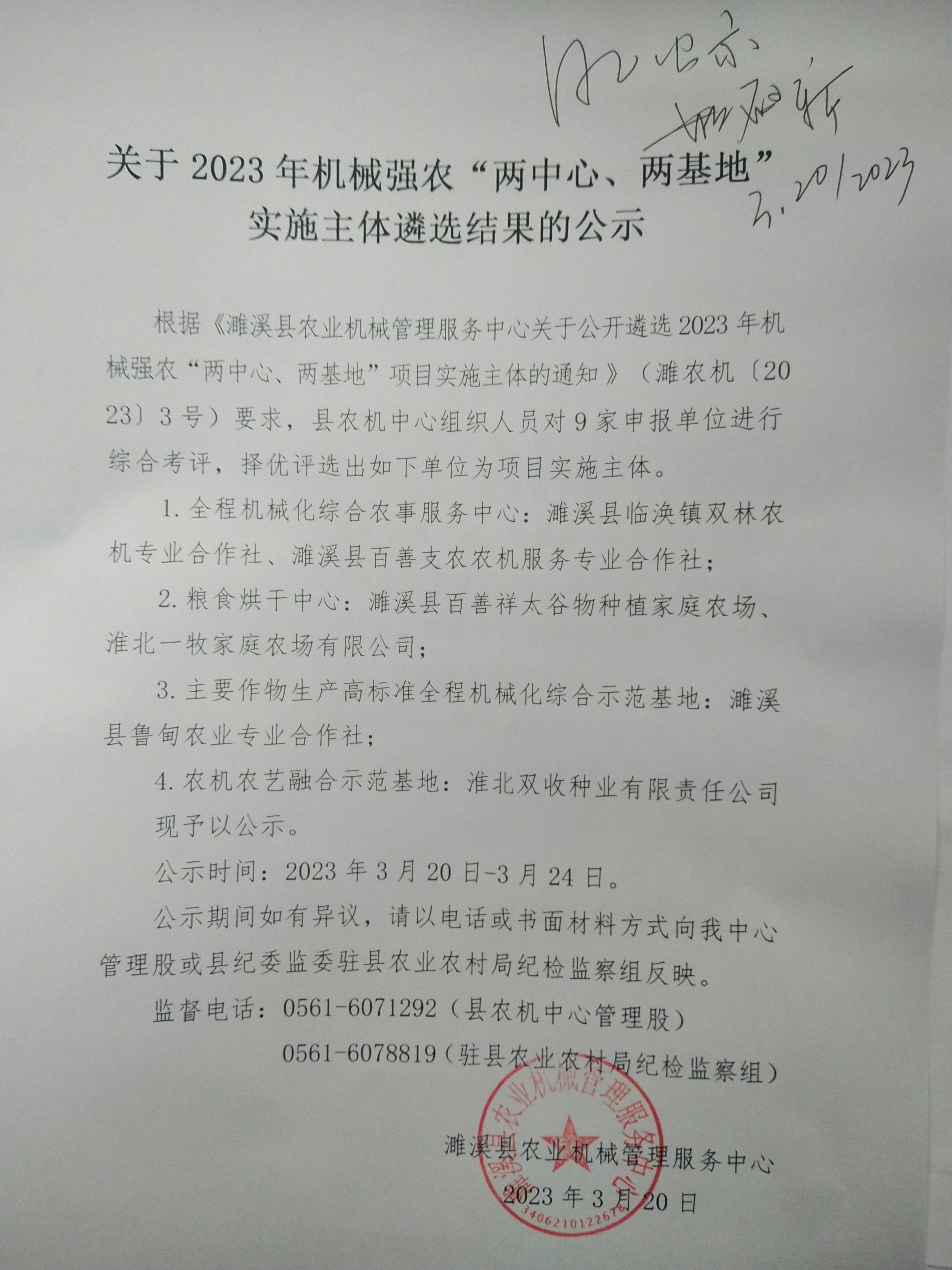根据《濉溪县农业机械管理服务中心关于公开遴选2023年机械强农“两中心、两基地”项目实施主体的通知 》(濉农机〔2023〕3号)要求,县农机中心组织人员对9家申报单位进行综合考评,择优评选出如下单位为项目实施主体。