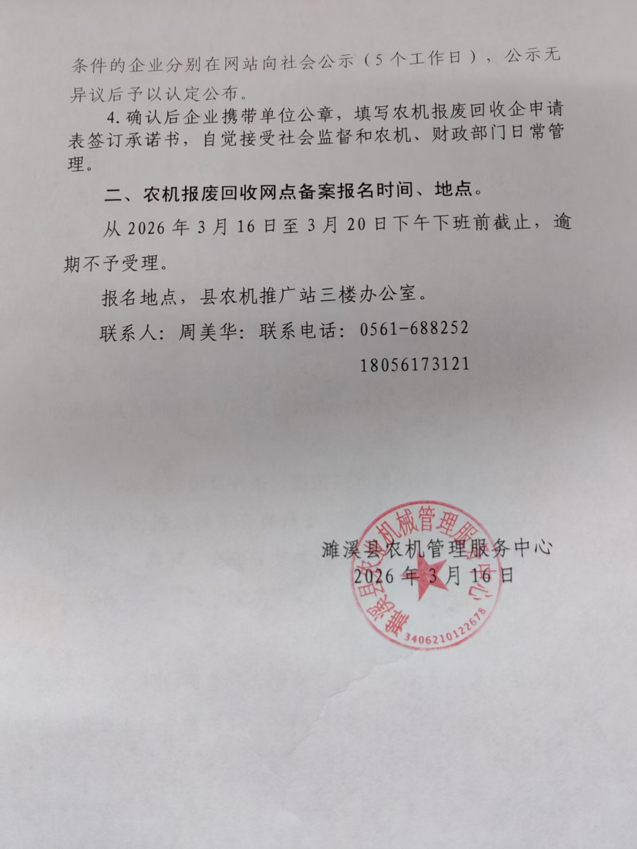 濉溪县2026年新增农机报废回收网点备案的通知 |