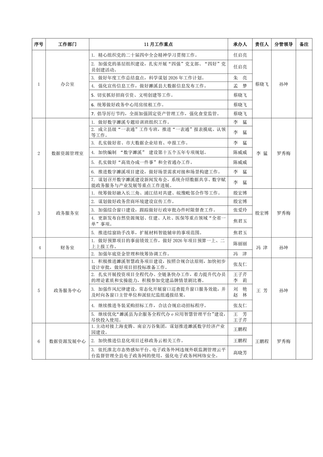 2025年濉溪县数据资源管理局11月份重点工作安排表