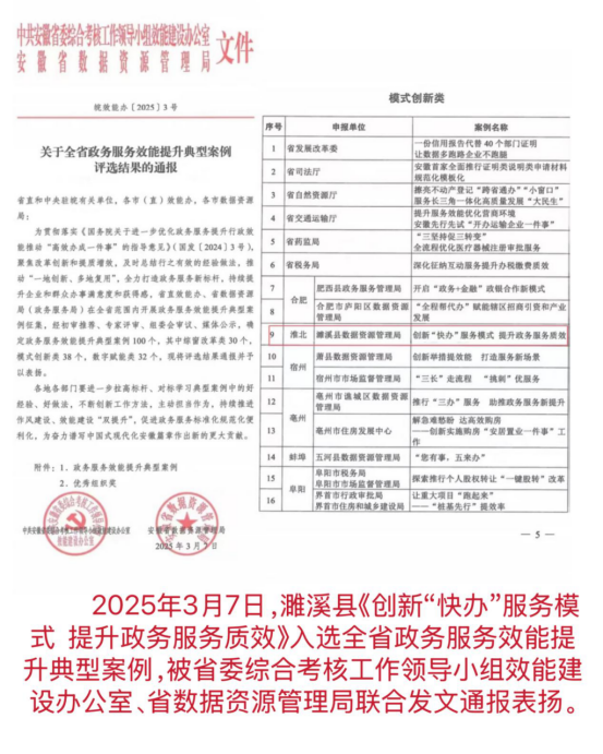 初心如磐,笃行致远。2025年3月,濉溪县政务服务“快办”志愿服务品牌事迹——《创新“快办”服务模式提升政务服务质效》入选全省政务服务效能提升典型案例,被中共安徽省委综合考核工作领导小组效能建设办公室、安徽省数据资源管理局联合发文通报表扬;4月,濉溪政务服务“快办”志愿服务队荣获“安徽青年五四奖章集体”荣誉称号。“快办”志愿服务队创新推出“标准化管理、集成化服务、容缺化办理”的政务服务新模式;精心设置三站一区:快办服务站、快办驿站、快办工作站、为企服务专区,让企业和群众只进“一扇门”就能办成“一揽子事”;积极践行“快办”十项承诺,多维度护企安商,助力濉溪经济高质量发展。2025年,线上线下共办理各类行政审批及政务服务事项97万余件,为企业和群众提供全程代办37161件、免费邮寄各类证照11666件、免费刻制公章2032枚,助力新增各类市场主体11227户,实现非税收入12.57亿元,群众满意度达99.99%。