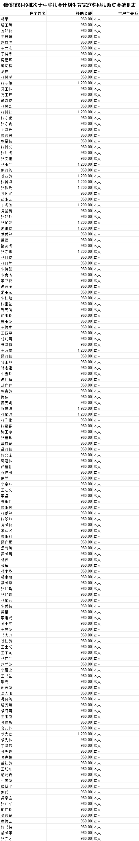 濉溪镇2025年农村计划生育奖励扶助惠农补贴资金单项分户清册