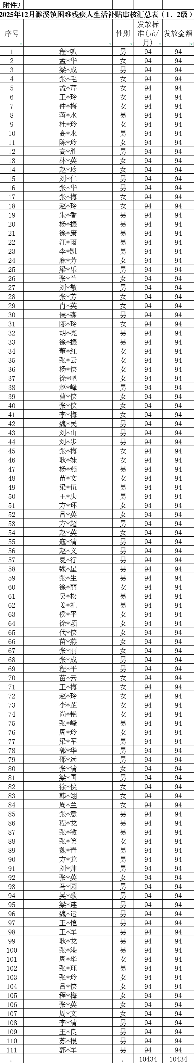2025年12月濉溪镇困难残疾人生活补贴审核汇总表(农业1、2级)