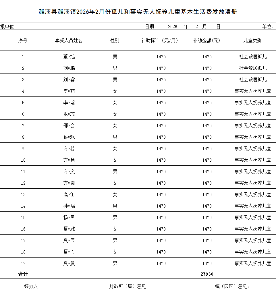 濉溪镇2026年2月份孤儿和事实无人抚养儿童基本生活费发放清册