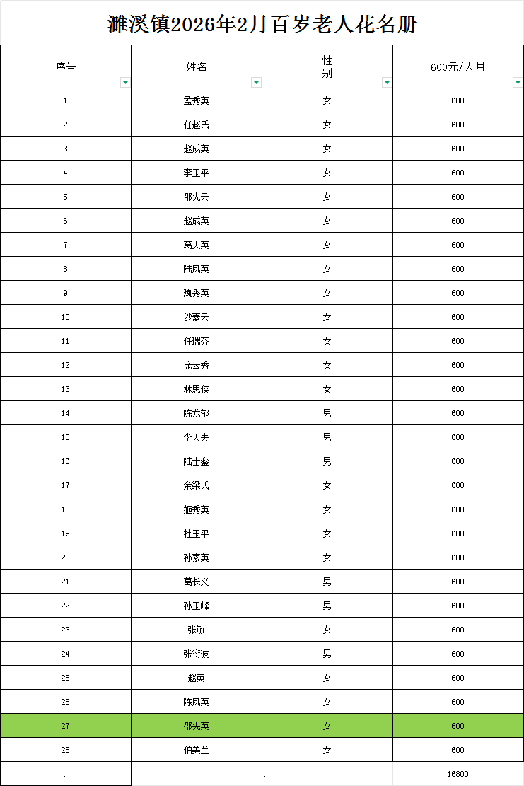 濉溪镇2026年2月百岁老人高龄津贴发放花名册
