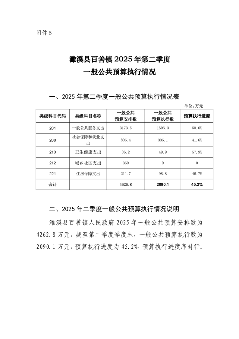 濉溪县百善镇2025年第二季度一般公共预算执行情况