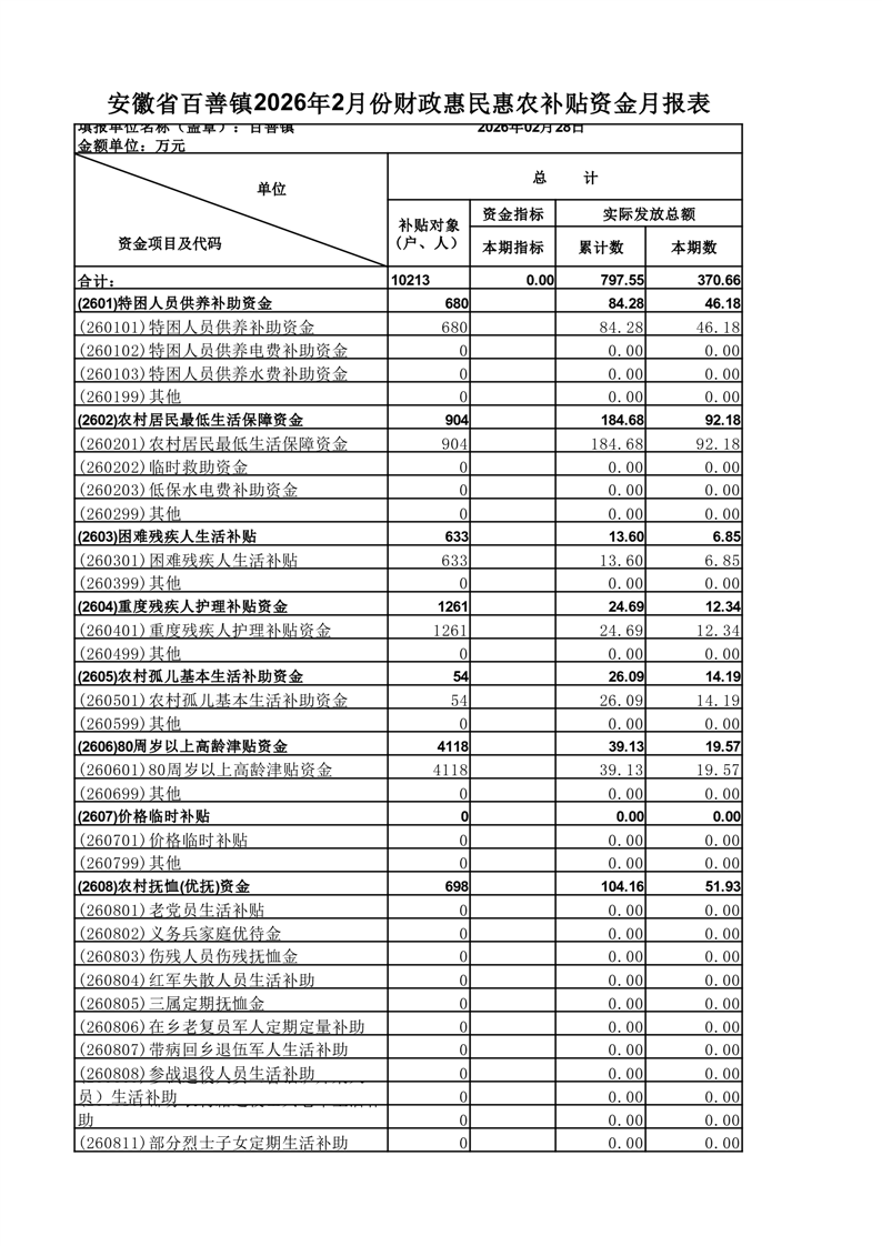 安徽省百善镇2026年2月份财政惠民惠农补贴资金月报表