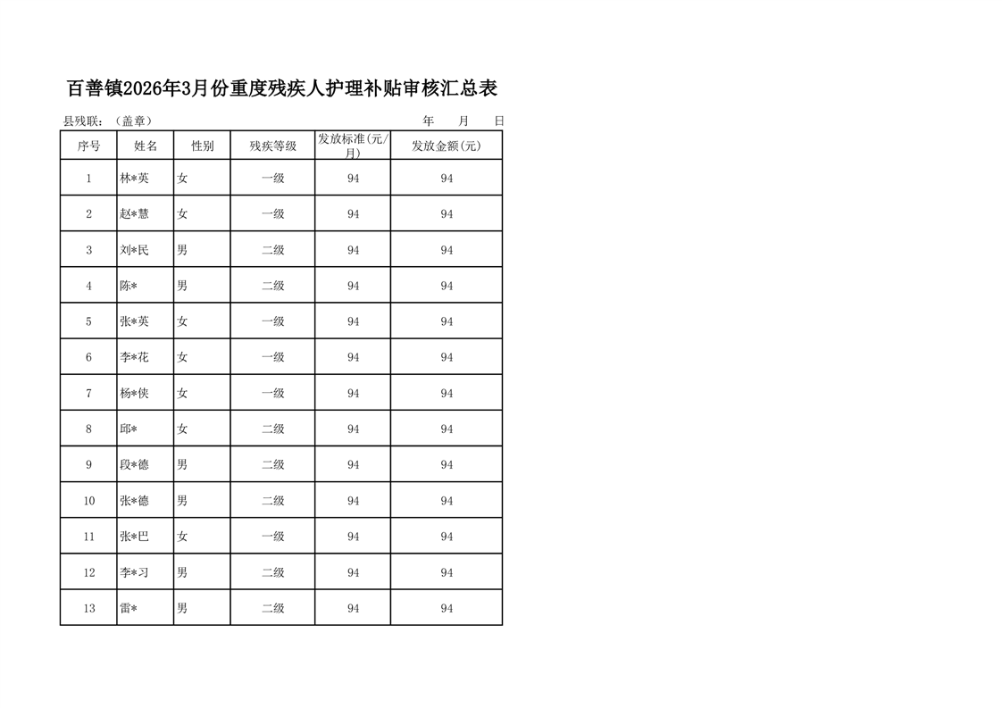 百善镇2026年3月份重度残疾人护理补贴审核汇总表
