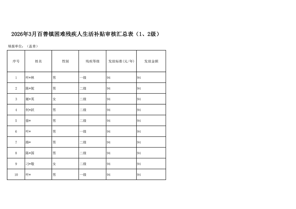 2026年3月百善镇困难残疾人生活补贴审核汇总表(1、2级)