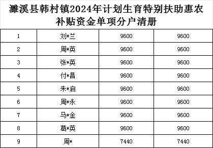 濉溪县韩村镇2024年计划生育特别扶助惠农补贴资金单项分户清册