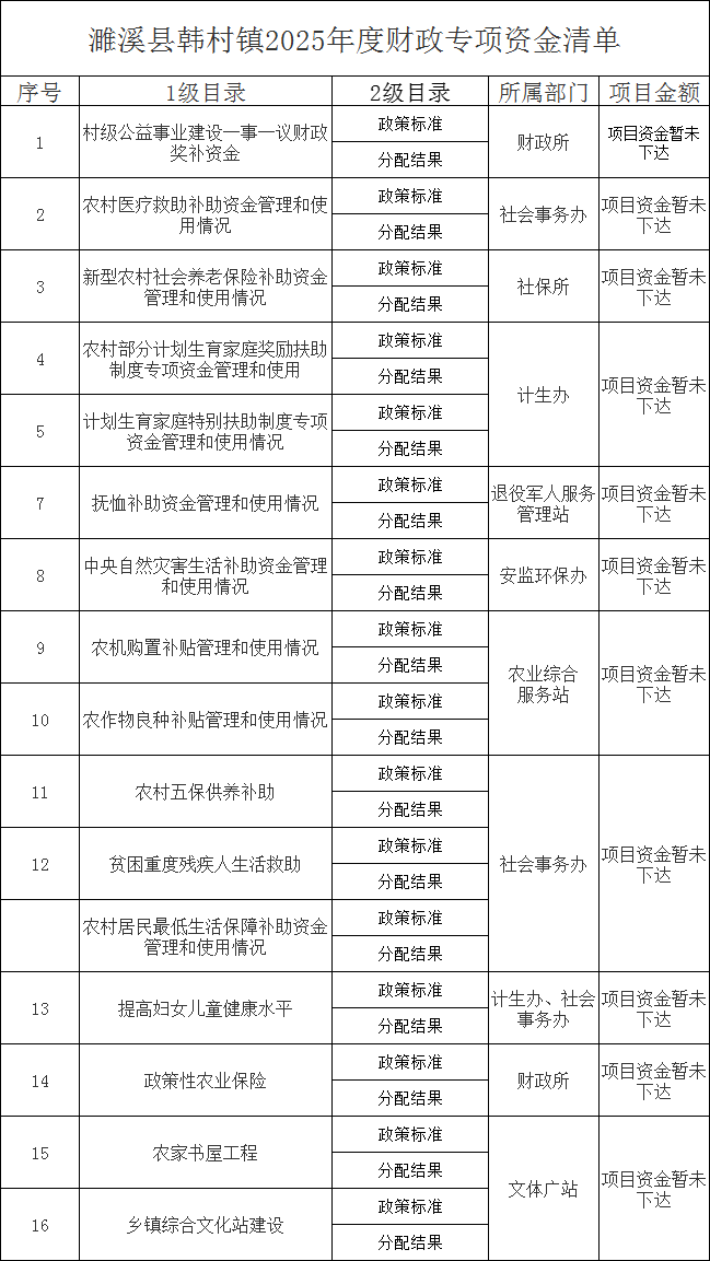 濉溪县韩村镇2025年度财政专项资金清单