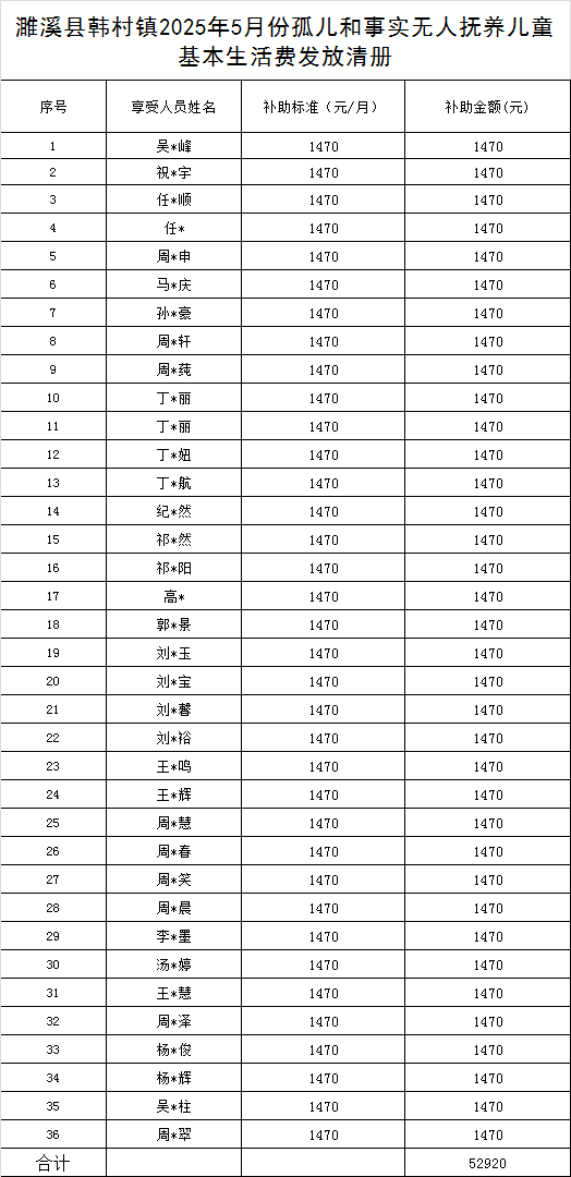 濉溪县韩村镇2025年5月份孤儿和事实无人抚养儿童基本生活费发放清册