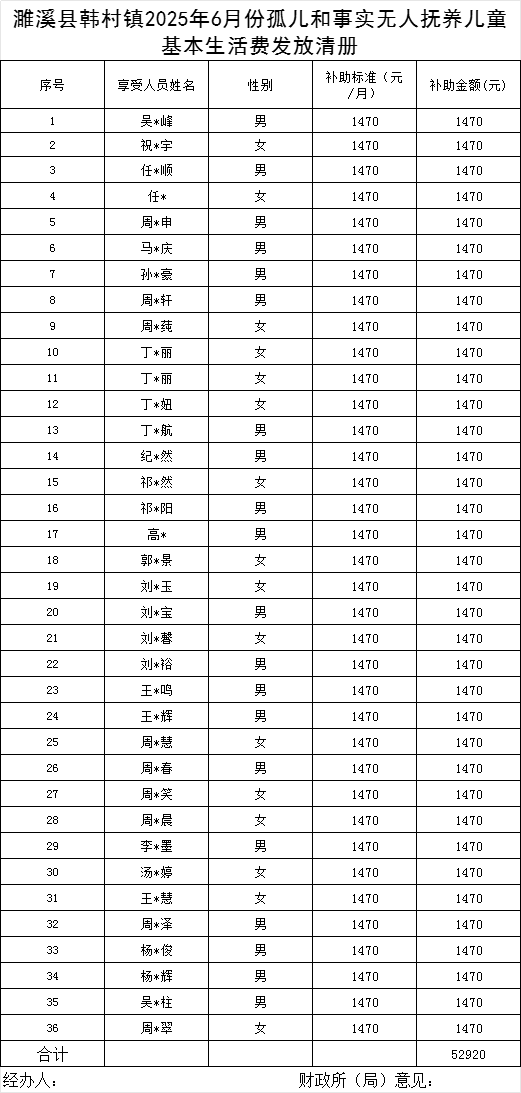 濉溪县韩村镇2025年6月份孤儿和事实无人抚养儿童基本生活费发放清册