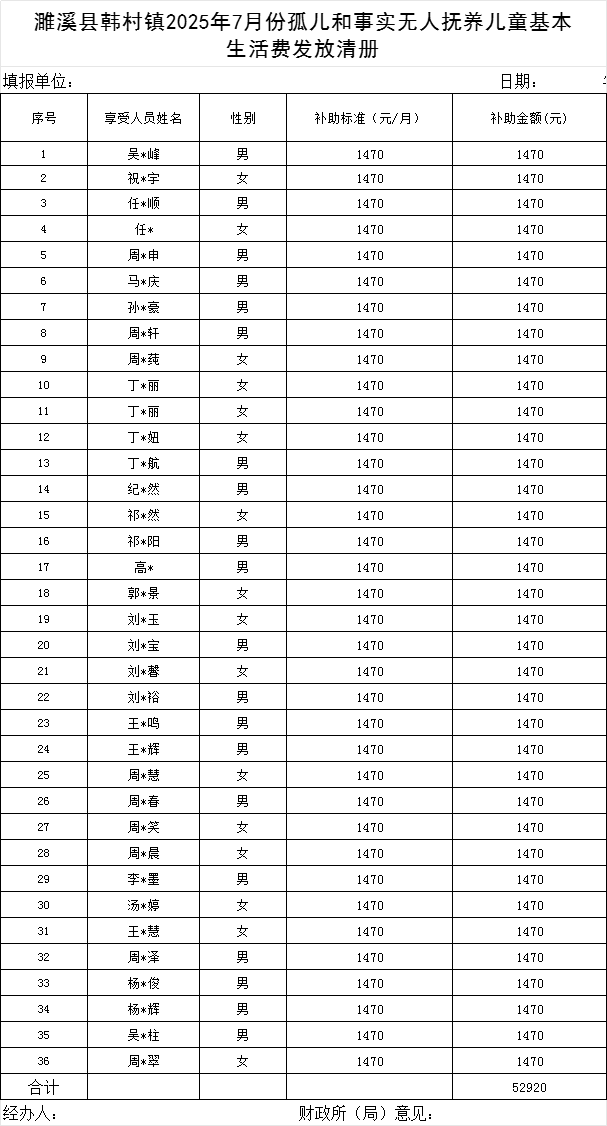 濉溪县韩村镇2025年7月份孤儿和事实无人抚养儿童基本生活费发放清册