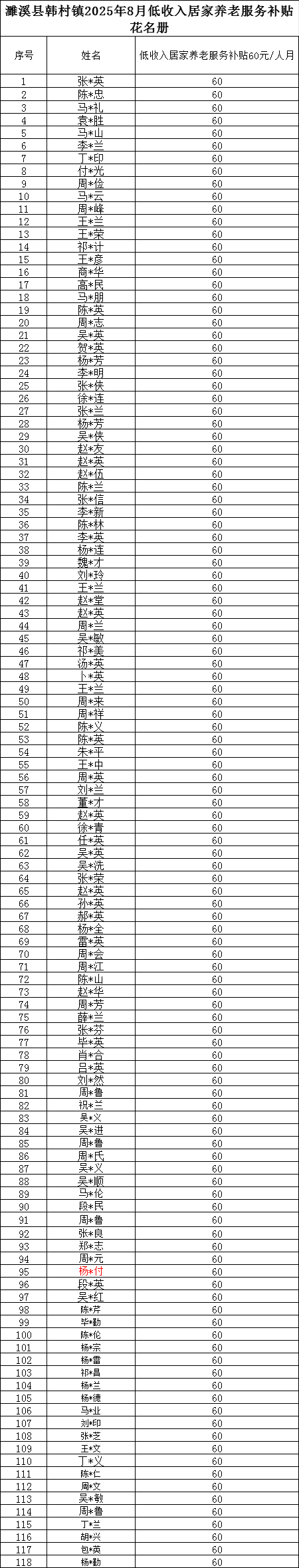 濉溪县韩村镇2025年8月低收入居家养老服务补贴花名册