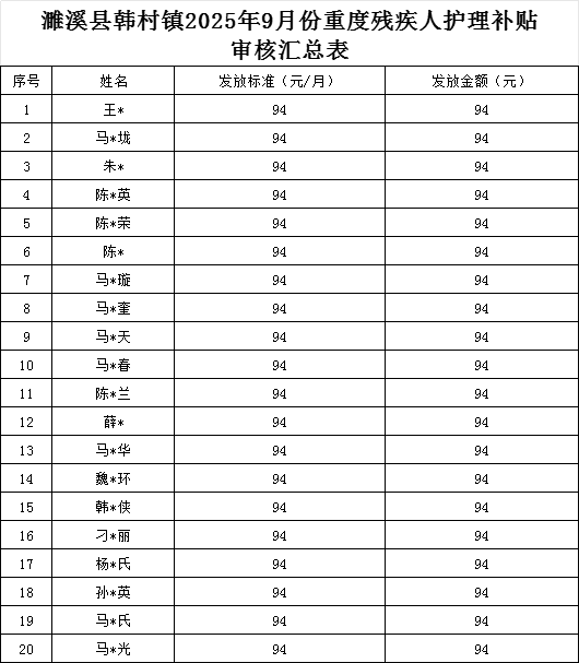 濉溪县韩村镇2025年9月份重度残疾人护理补贴审核汇总表