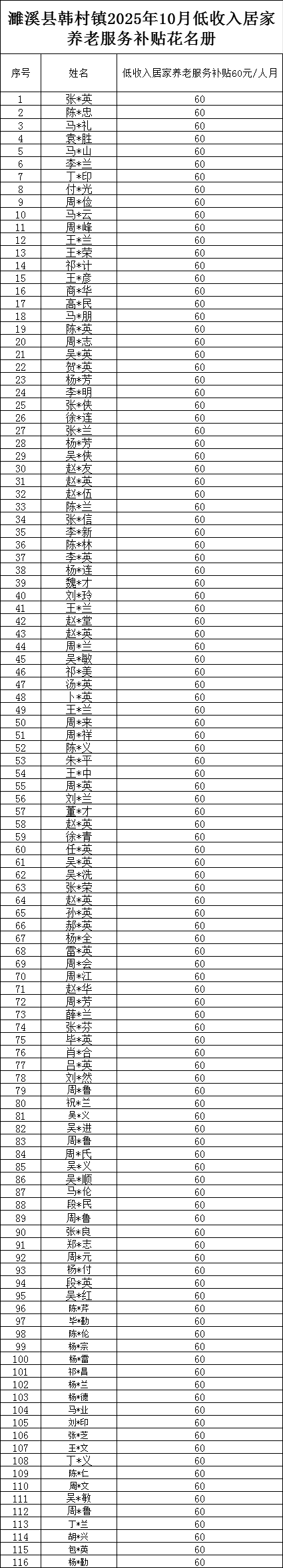 濉溪县韩村镇2025年10月低收入居家养老服务补贴花名册