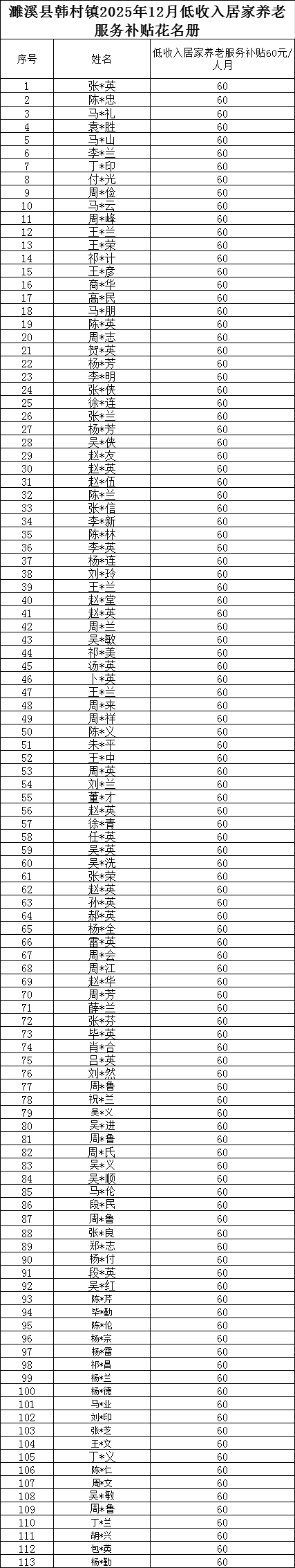 濉溪县韩村镇2025年12月低收入居家养老服务补贴花名册