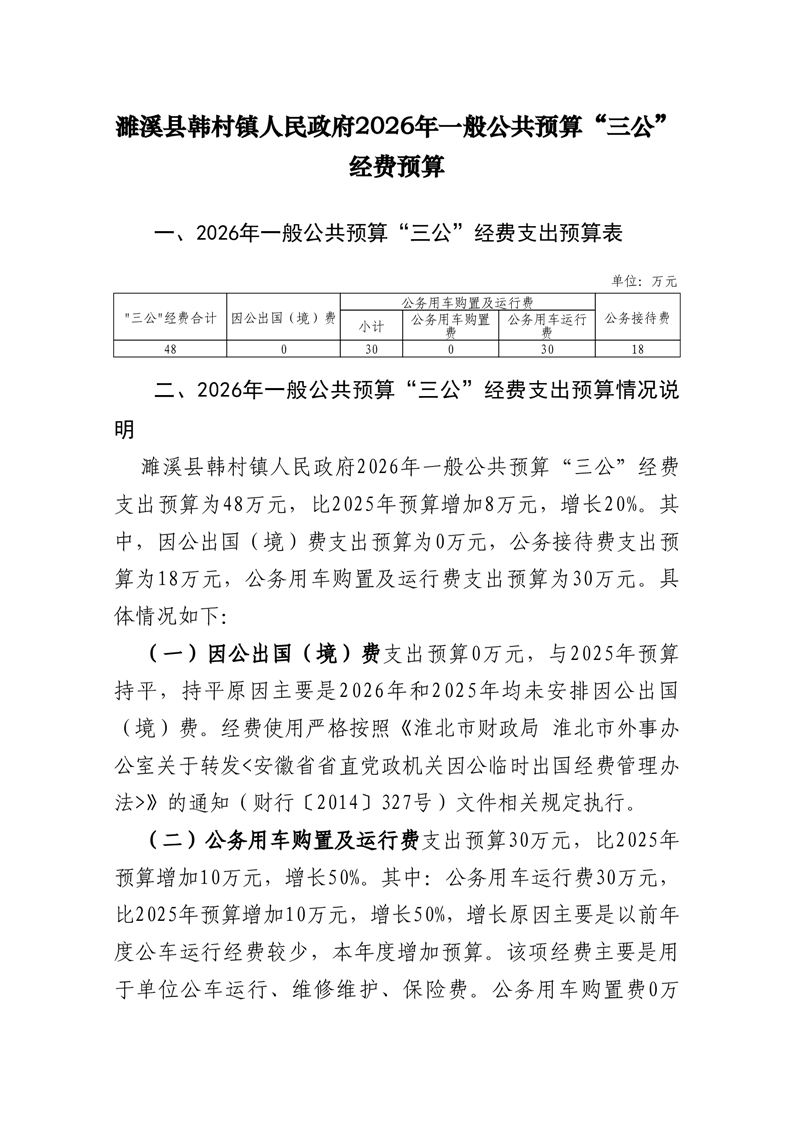 濉溪县韩村镇人民政府2026年一般公共预算“三公”经费预算