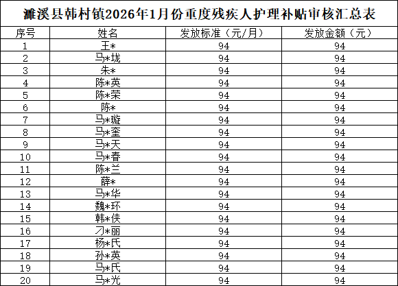 濉溪县韩村镇2026年1月份重度残疾人护理补贴审核汇总表