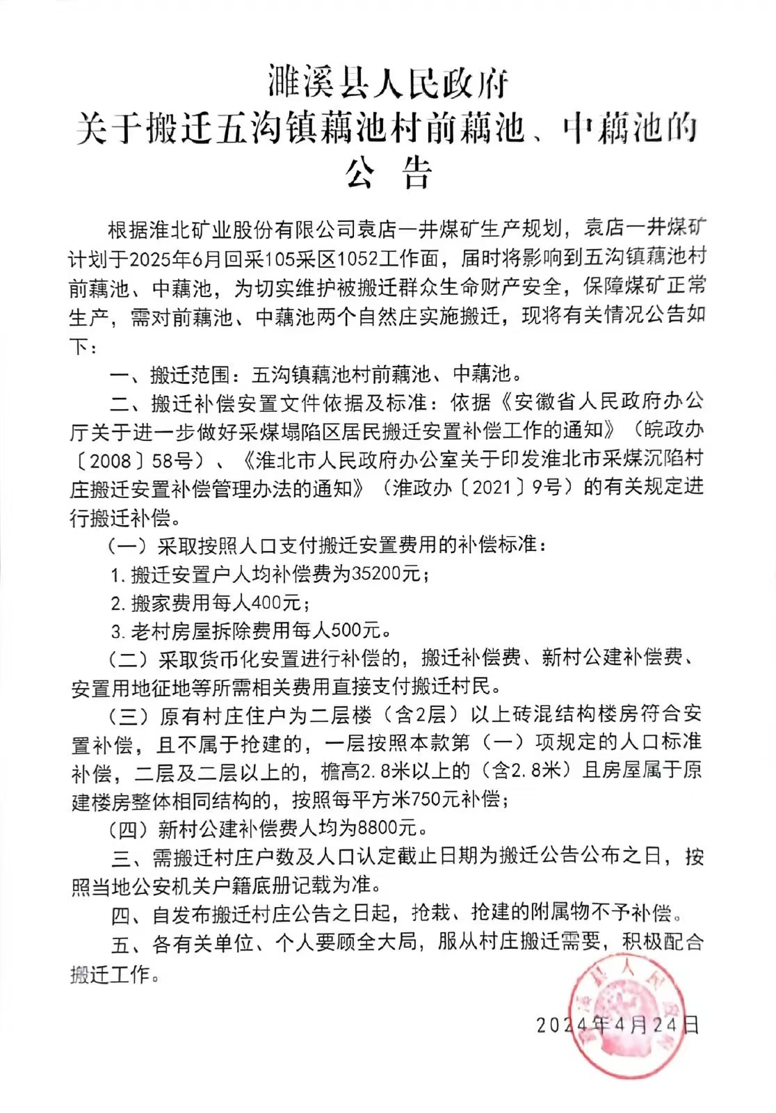 濉溪县人民政府关于搬迁五沟镇藕池村前藕池、中藕池的公告
