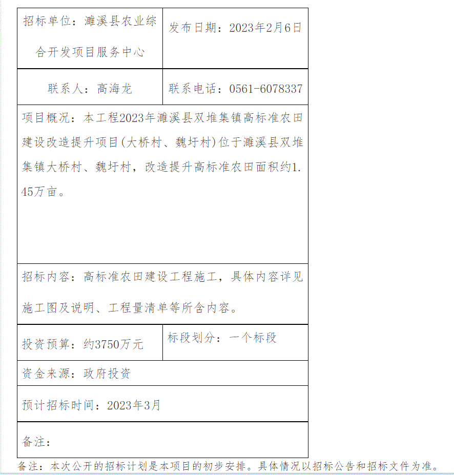 2023年濉溪县双堆集镇高标准农田建设改造提升项目(大桥村、魏圩村)招标计划