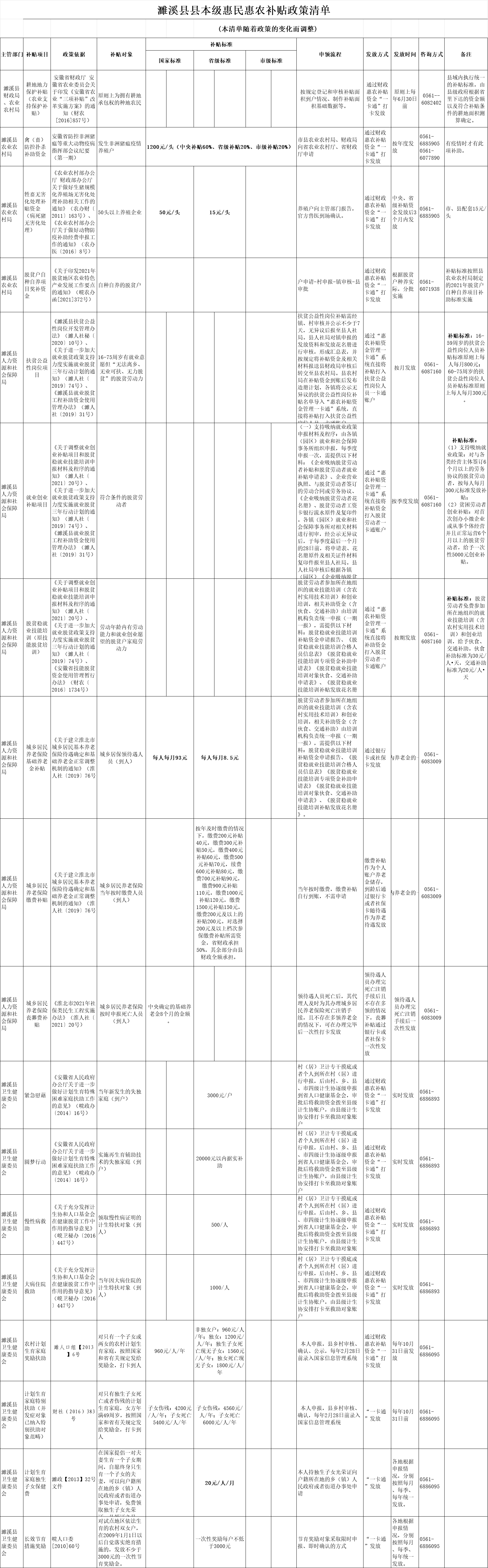【转发】濉溪县县本级惠民惠农补贴政策清单