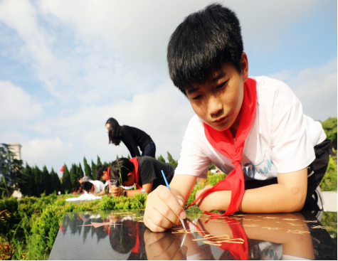活动现场,团员和少先队员们在工作人员指导下,手持毛刷与红漆,小心翼翼地拂去墓碑上的浮尘,而后一笔一划地为模糊的碑文字迹描红。他们神情专注,每一笔描摹都饱含敬意,将对英烈的追思与崇敬融入红色颜料中。“这不是简单的涂色,而是与先烈的对话,每一个字都重若千钧。”少先队员王紫妍在描红时说道。