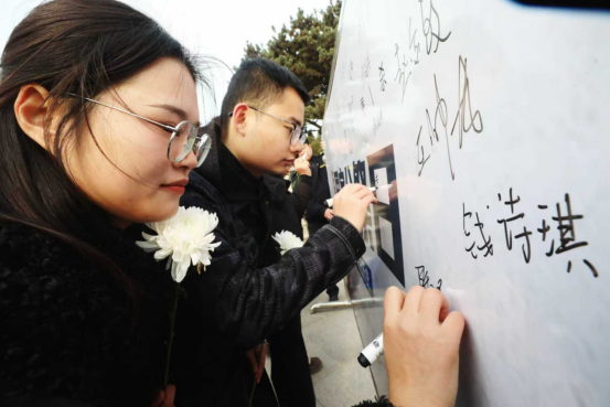 活动现场,秩序井然、气氛肃穆。参与人员首先在指定地点集合整队,党员同志统一佩戴党徽,彰显党员身份;随后,大家在“铭记历史、珍爱和平”誓言展板上郑重签字,一笔一划间传递着对历史的敬畏、对和平的坚守,签字完毕后,每人领取手持菊花,为缅怀仪式做准备。