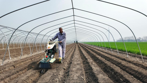姜农利用专业机械开挖生姜种植沟陇