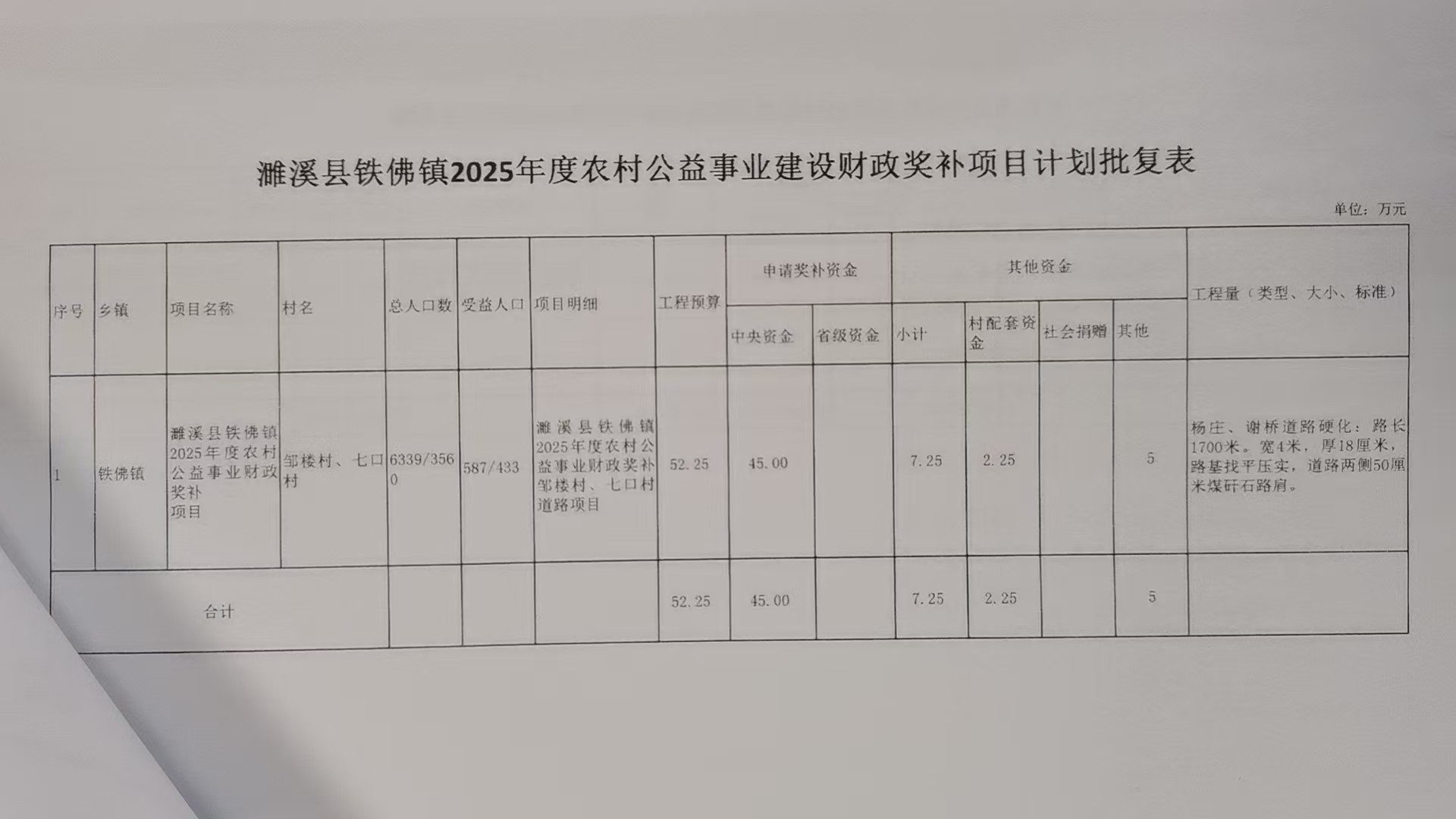 铁佛镇2025年村级公益事业建设财政奖补项目批复表
