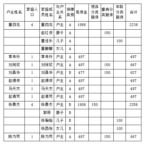 类别 低保金 残疾分类施保 重病分类施保 年龄分类施保 合计