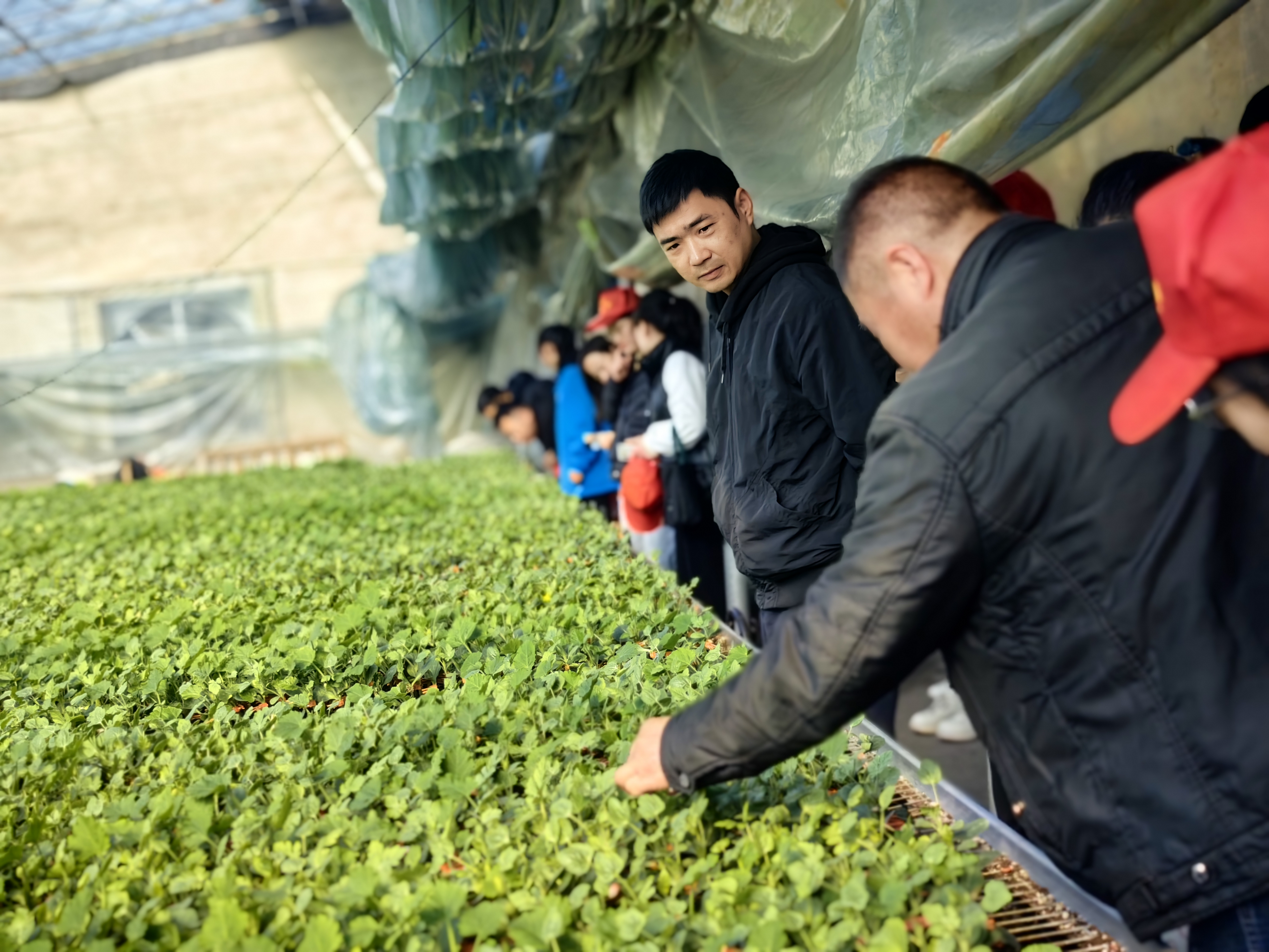 随后,在工作人员的带领下,师生们来到了育苗大棚。一株株绿油油的嫩芽整齐有序排列着,展现出了勃勃生机,工人们正忙碌着进行育苗嫁接。农场的育苗员认真向学生们讲解西瓜育苗和嫁接栽培技术,让学生们了解西瓜从育苗到种植的农业知识。在育苗员的讲解和指导下,大家了解了什么是嫁接技术以及嫁接的好处,更是过了一把当“育苗专家”的瘾。